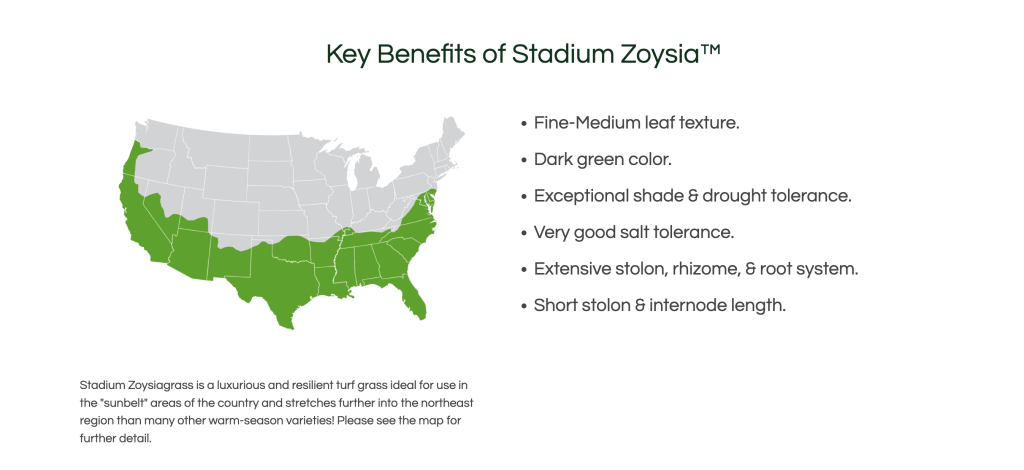 With its proven adaptability, Stadium Zoysia™ thrives throughout the Sunbelt region—extending farther north than many warm-season varieties thanks to its short dormancy period and strong cold tolerance.